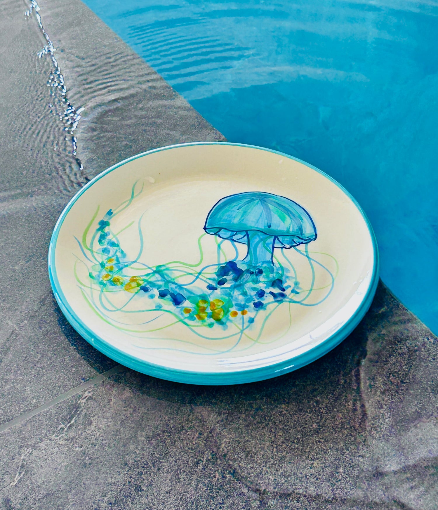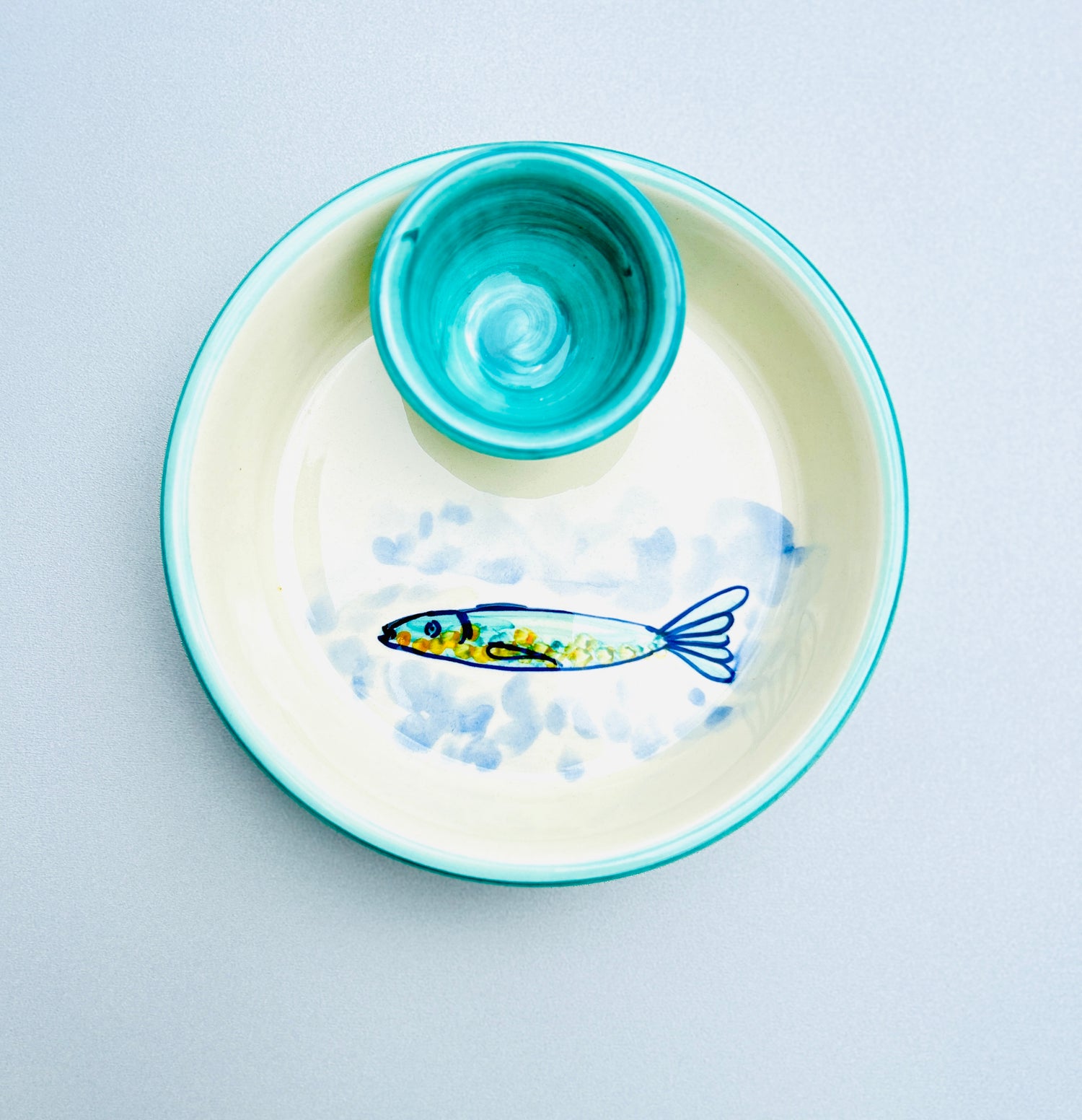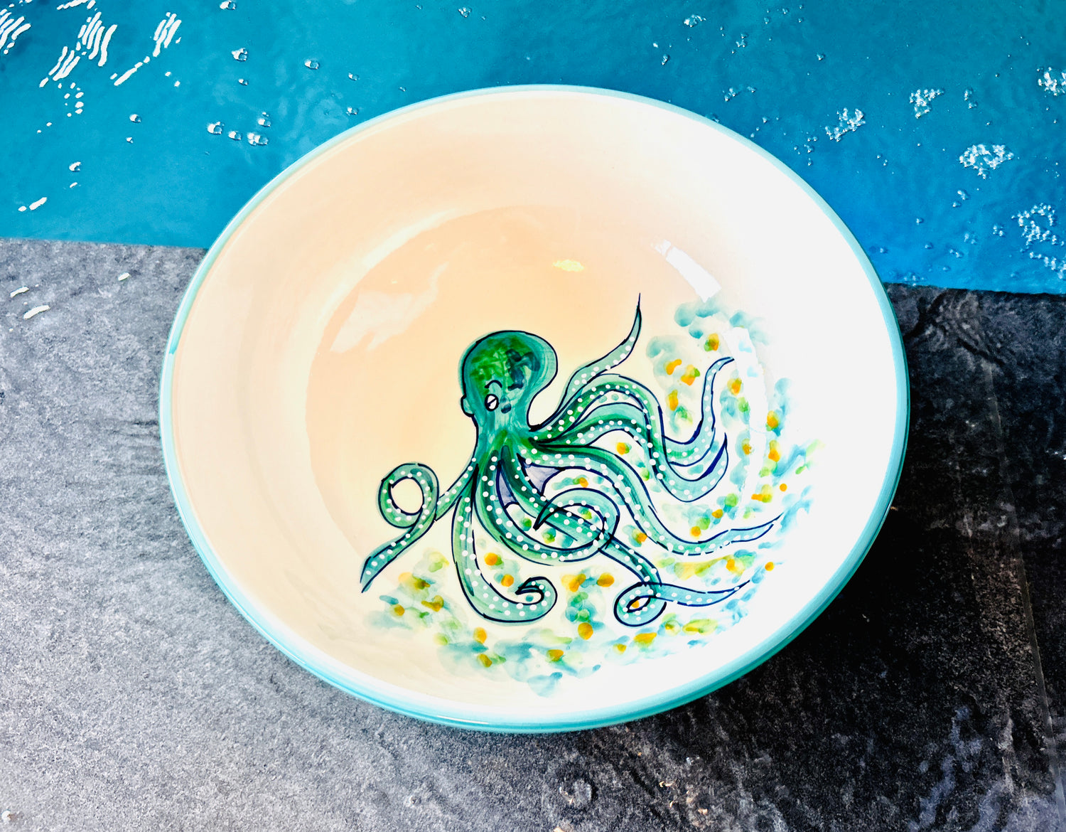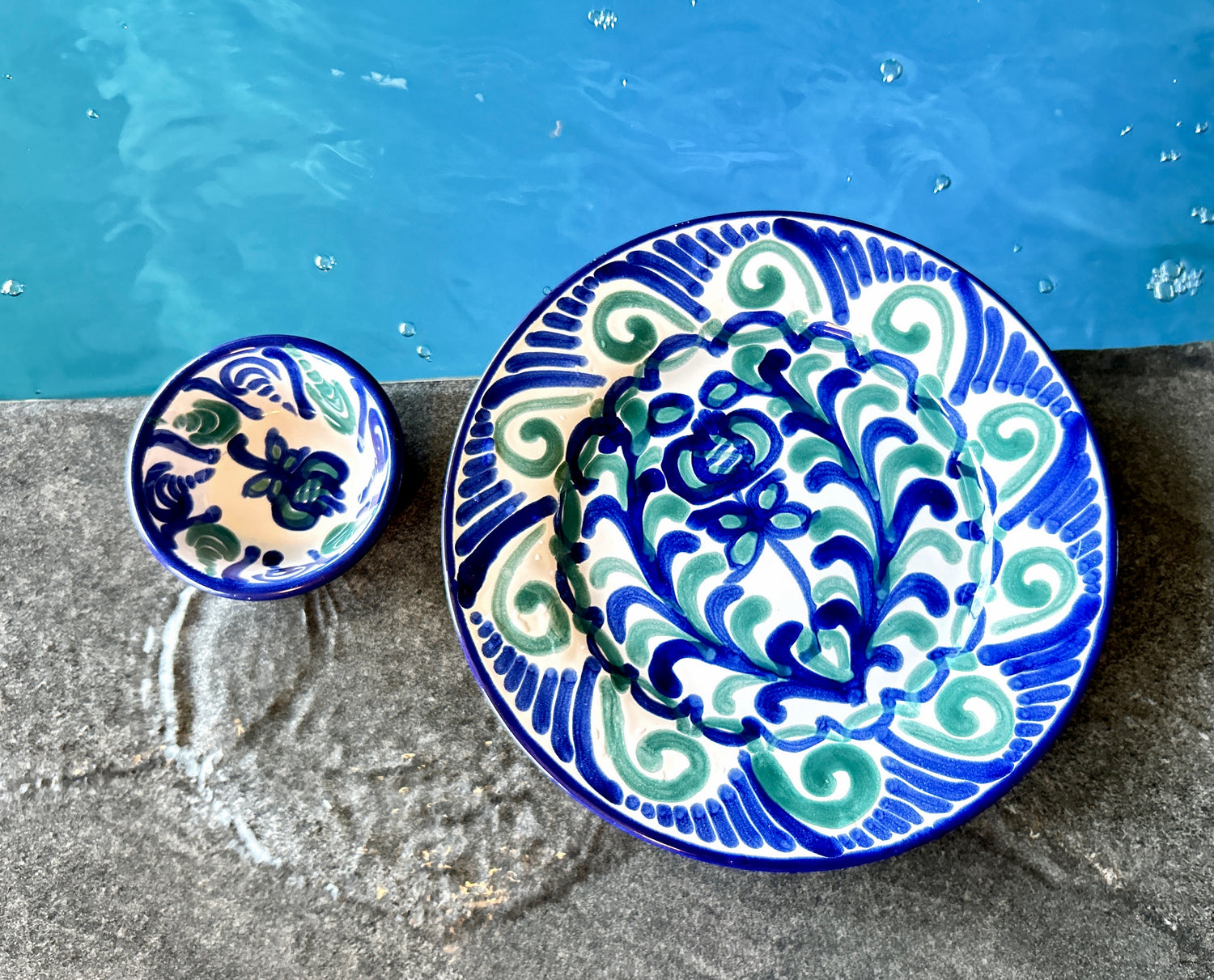 Die "Azur" Kollektion fängt die Essenz der Küste mit handgemalten Designs ein, die an das sich ständig verändernde Türkis des Meeres erinnern. Jedes Stück ist ein Unikat, mit fließenden Pinselstrichen in verschiedenen Blau- und Türkistönen, die sich zu einem beruhigenden und dennoch dynamischen Muster vereinen. Dunkelblaue Akzente betonen die Form und erinnern an die tiefsten Stellen des Ozeans. Das Ergebnis ist ein Gefühl von handwerklicher Eleganz, das jedem Tisch eine Brise Küstenfrische verleiht.