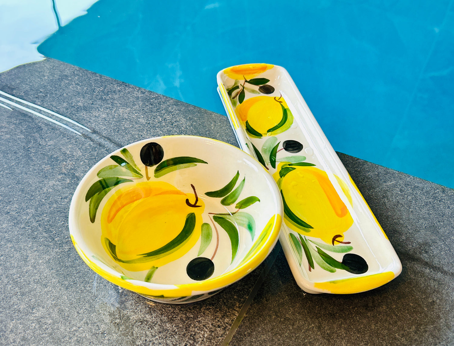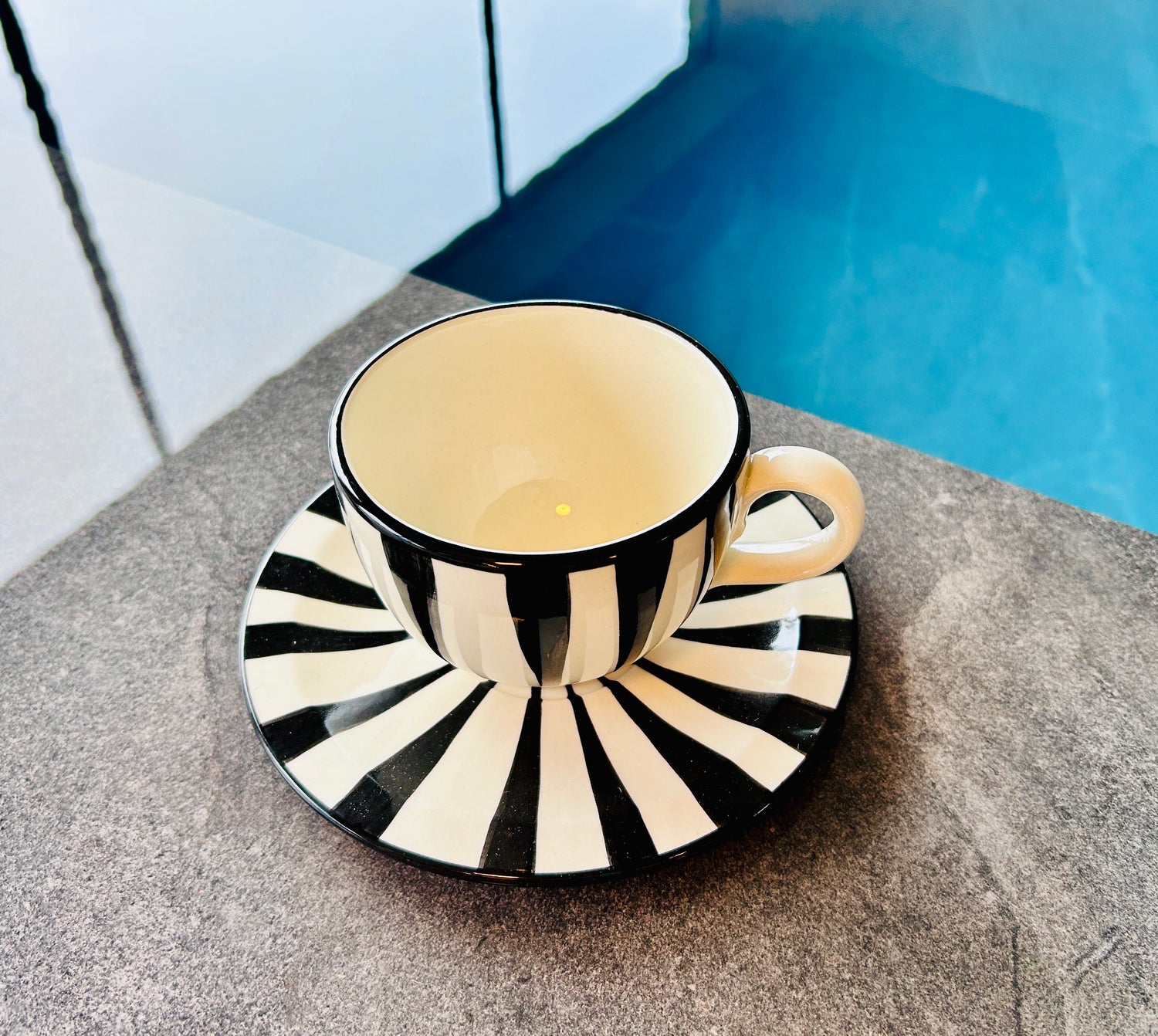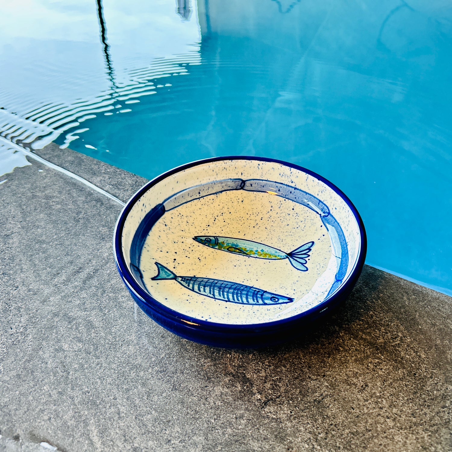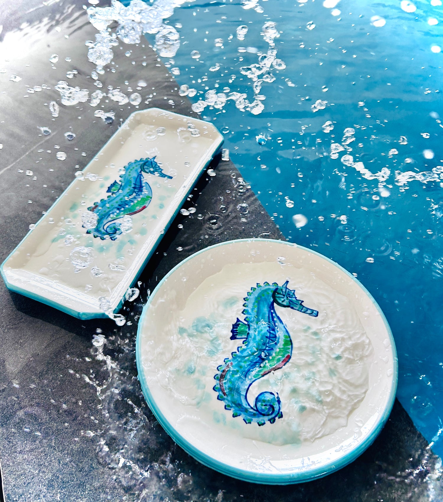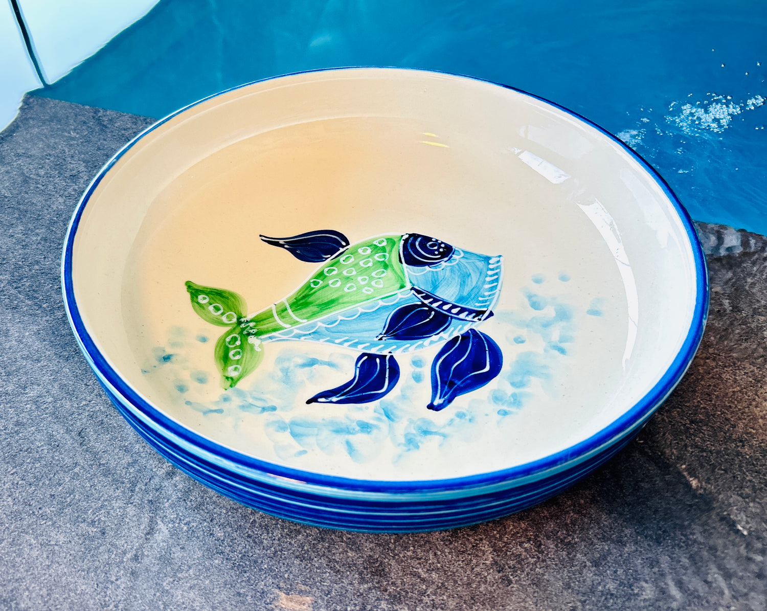 Die "Azur" Kollektion fängt die Essenz der Küste mit handgemalten Designs ein, die an das sich ständig verändernde Türkis des Meeres erinnern. Jedes Stück ist ein Unikat, mit fließenden Pinselstrichen in verschiedenen Blau- und Türkistönen, die sich zu einem beruhigenden und dennoch dynamischen Muster vereinen. Dunkelblaue Akzente betonen die Form und erinnern an die tiefsten Stellen des Ozeans. Das Ergebnis ist ein Gefühl von handwerklicher Eleganz, das jedem Tisch eine Brise Küstenfrische verleiht.
