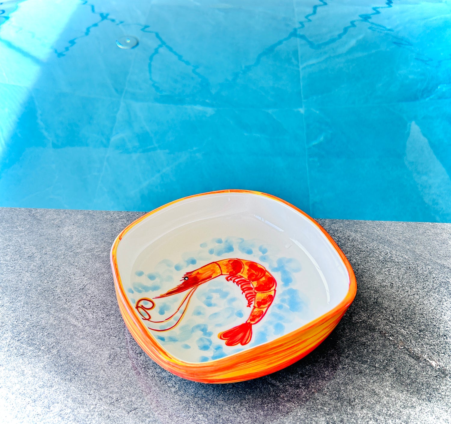 Das Motiv der Kollektion "Carlos" zeigt eine kunstvoll gestaltete Garnele, die durch ihre leuchtenden Orangetöne und filigranen Details besticht. Die dynamische Darstellung der Garnele mit geschwungenen Linien und zarten Farbverläufen vermittelt ein Gefühl von Bewegung und Lebendigkeit. Umgeben von angedeuteten Wasserstrukturen in sanften Blautönen bringt das Motiv die faszinierende Schönheit der Unterwasserwelt auf kreative Weise zum Ausdruck.