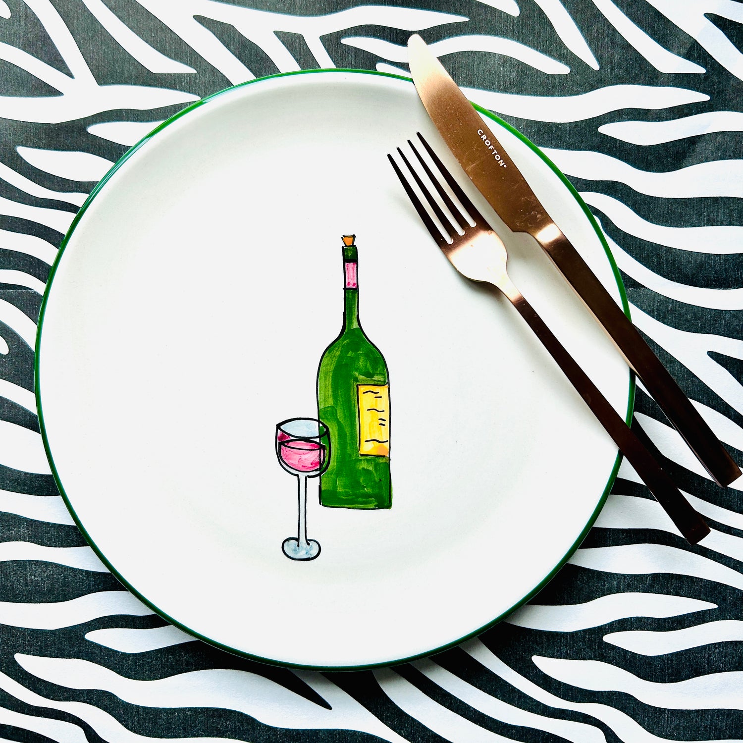 Das Motiv der Kollektion „Weinfreude“ zeigt eine Reihe von stilisierten, handgezeichneten Flaschen in kräftigen Farben wie Grün, Gelb, Rosé und Blau. Jede Flasche ist individuell gestaltet und hebt sich durch ihre charakteristische Farbe und Form von den anderen ab. Die Flaschen sind mit klaren, schwarzen Konturen umrandet und mit einem weißen Etikett versehen, was dem Motiv einen modernen, grafischen Look verleiht. Die lockere, leicht verspielte Anordnung und die leuchtenden Farben vermitteln Lebensfreude und laden zum Genießen ein.