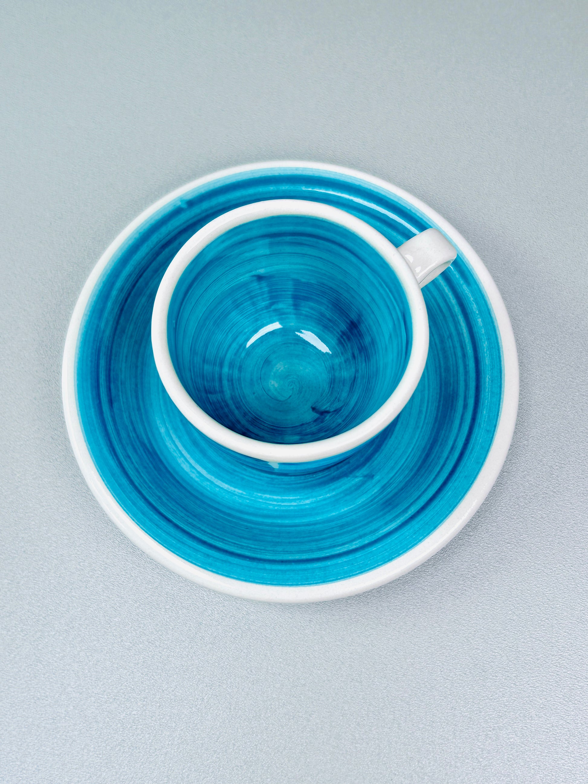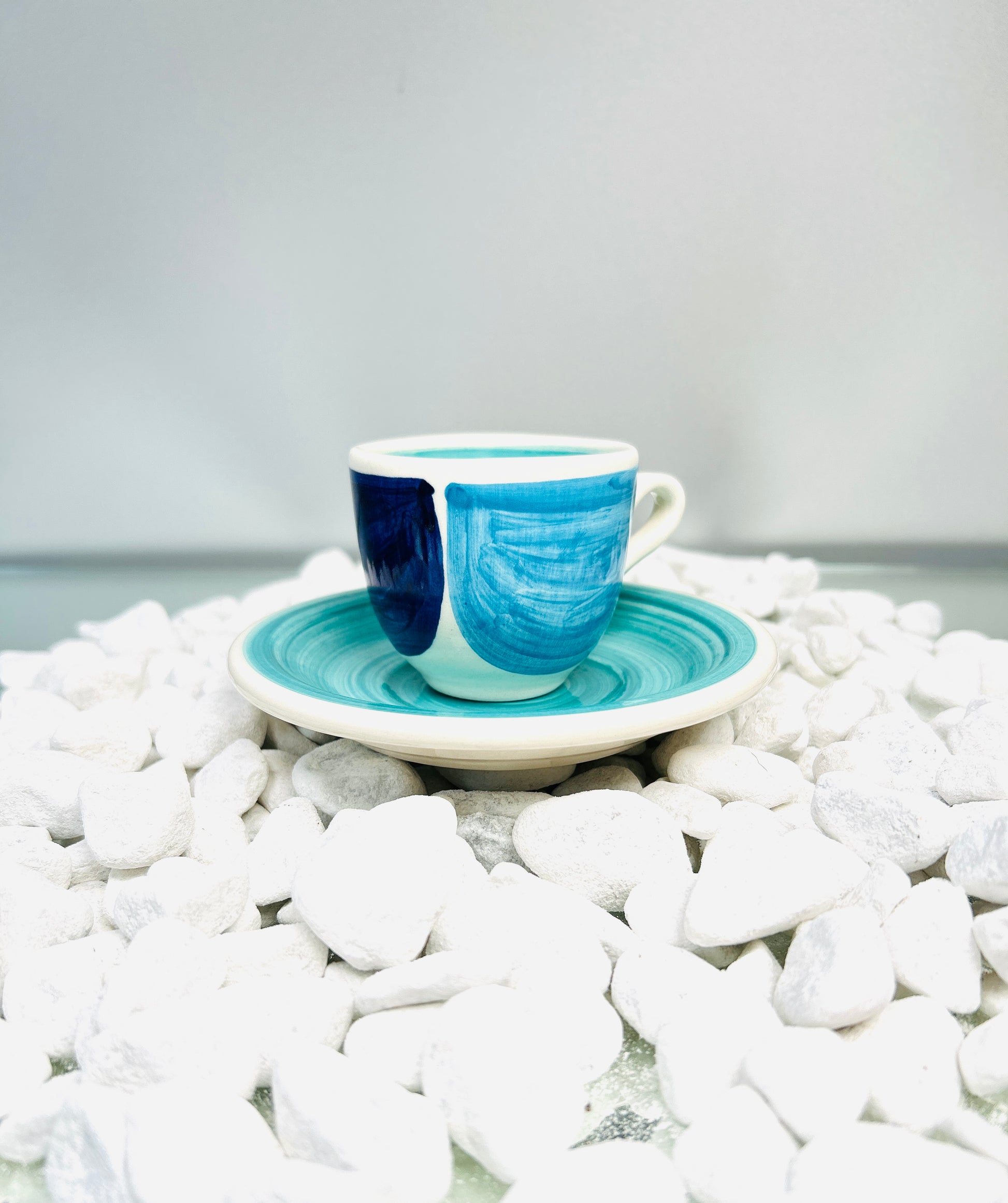 Tauche ein in die beruhigende Welt der "Azur" Kollektion mit dieser charmanten Espresso- Tasse mit Untertasse. Jedes Set ist ein kleines Kunstwerk, handgefertigt und handbemalt, um die dynamischen Nuancen des Ozeans einzufangen. Sanfte Pinselstriche in Türkis, Azurblau und Weiß tanzen auf der Oberfläche und erzeugen ein lebendiges, aber beruhigendes Muster. Jede Tasse inkl. Untertasse ist ein Unikat mit individuellen Pinselstrichen. Perfekt für einen kräftigen Espresso oder einen doppelten Ristretto.