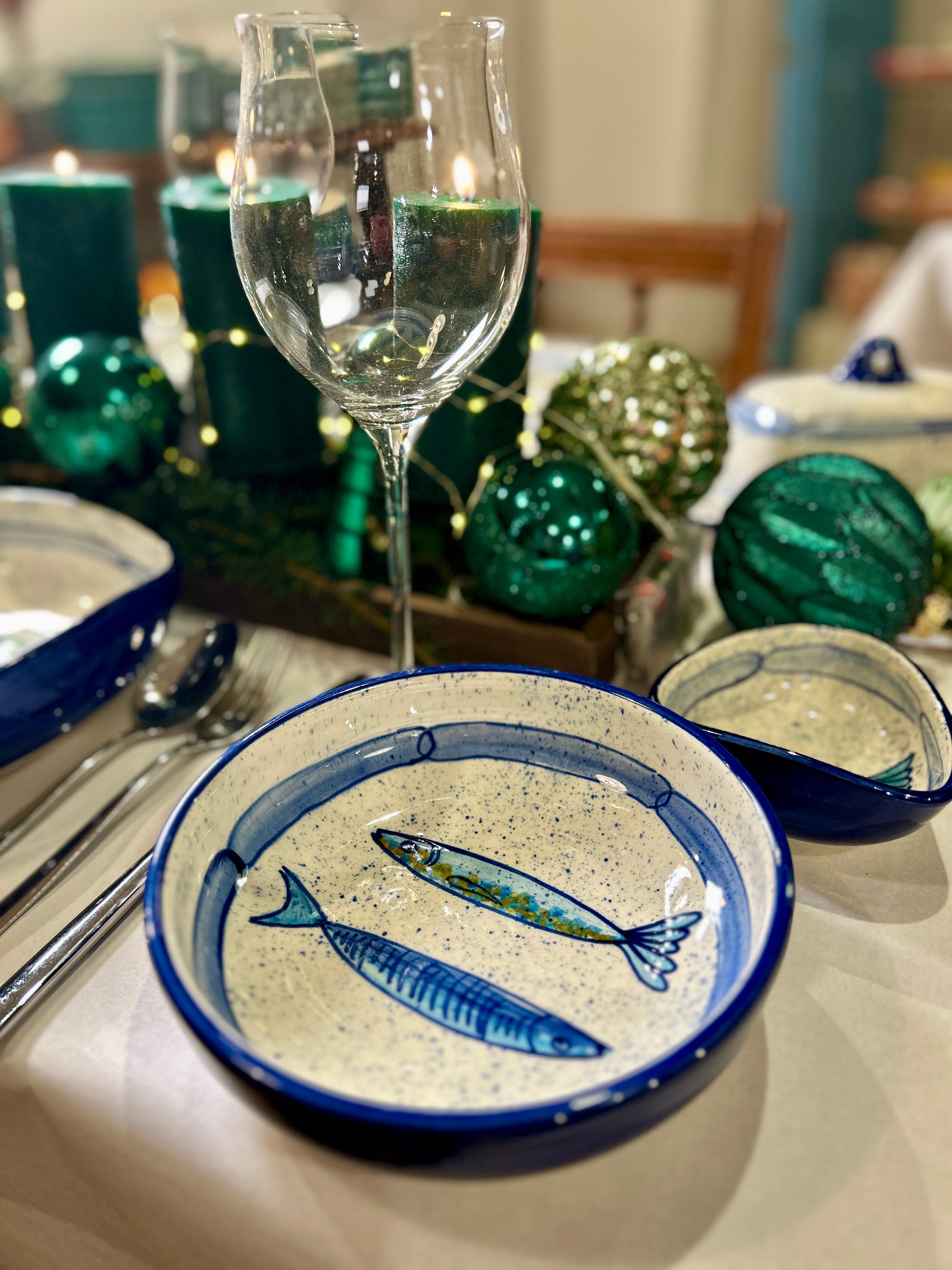 Die Schale aus der Kollektion "Sardinen" bringt eine frische Brise an Ihren Tisch. Das handgemalte Motiv zeigt zwei stilisierte Sardinen in verschiedenen Blautönen auf einem cremeweißfarbenen Hintergrund, der mit zarten blauen Sprenkeln verziert ist. Die obere Sardine ist als klares Linienmuster dargestellt, während die untere mit feinen Farbakzenten in Blau und einem Hauch von Grün verziert ist. Ein ungewöhnlicher, kettenartiger, blauer Rand rahmt das Motiv ein und verleiht der Schale einen rustikalen, maritimen Charme. Die tiefe Form macht sie ideal für vielseitige Anwendungen.
