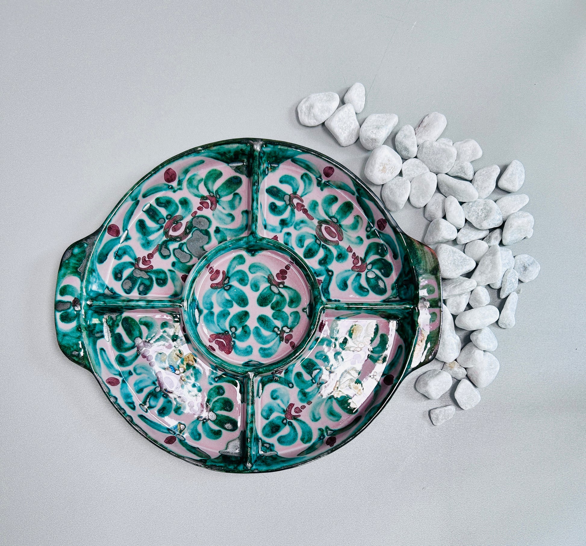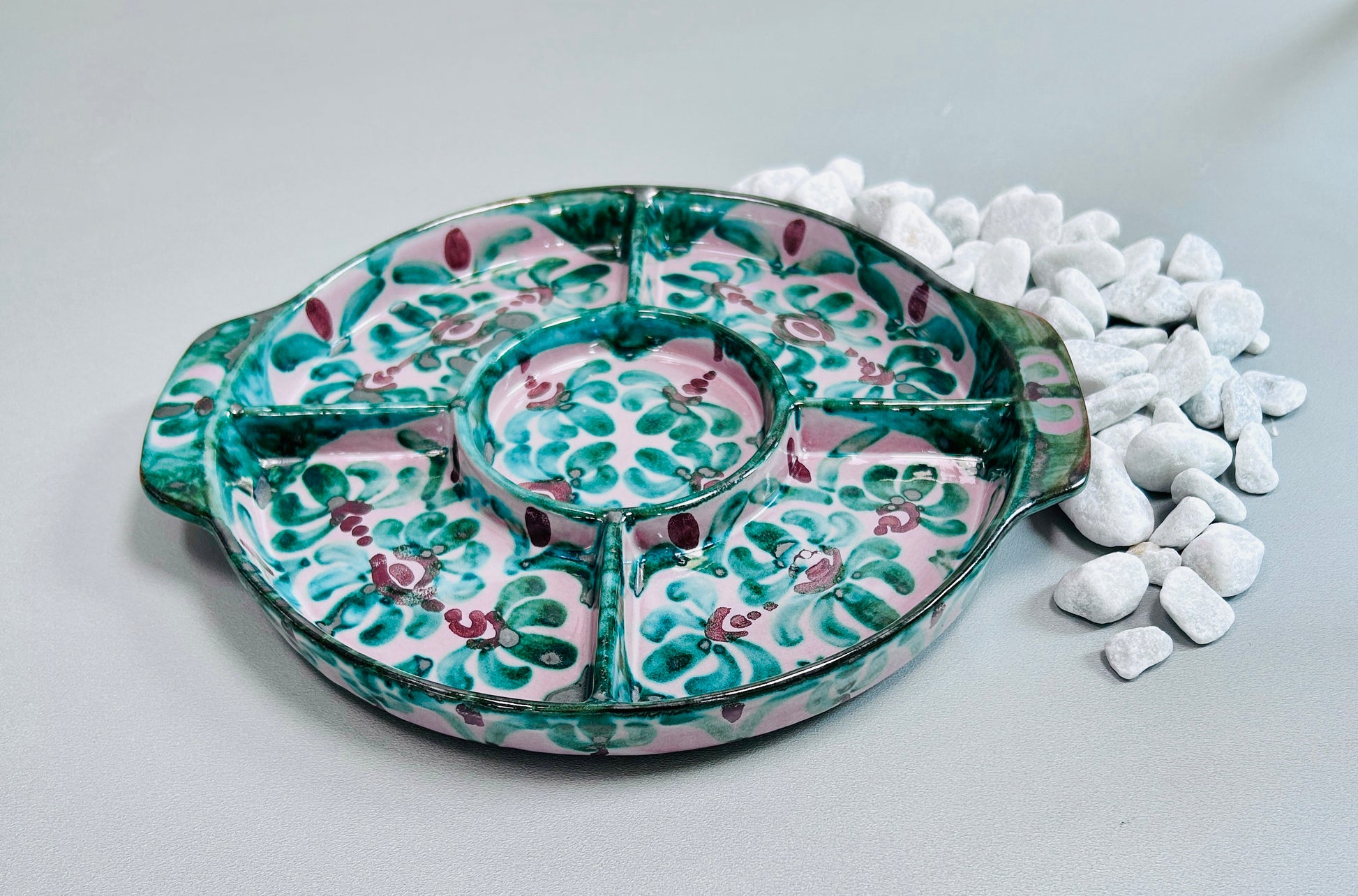 Die Servierschale aus der spanischen Kollektion "Florentina" bringt den Charme Spaniens auf Ihren Tisch. Das handgemalte Motiv zeigt stilisierte Blumenornamente und verschnörkelte Ranken in sattem Dunkelgrün und warme Brauntöne auf cremefarbenem Grund. Die Schale ist in vier Segmente unterteilt, mit einer runden Dipschale in der Mitte, sodass Sie verschiedene Köstlichkeiten stilvoll präsentieren können. Praktische Griffe an den Seiten erleichtern das Tragen. Diese Schale ist perfekt, um Ihre Gäste mit Tapas oder Dips zu verwöhnen und Ihren Tisch mit einem Hauch spanischer Tradition zu bereichern.